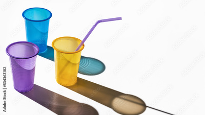 Three multi-colored plastic cups with drinking straws on a white background. Long shadows.