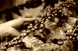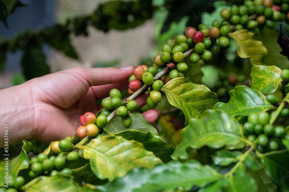 Hand of farmer trying to picking coffee cherries seed in coffee plantation. Coffee is not just a drink. It's a global commodity.
