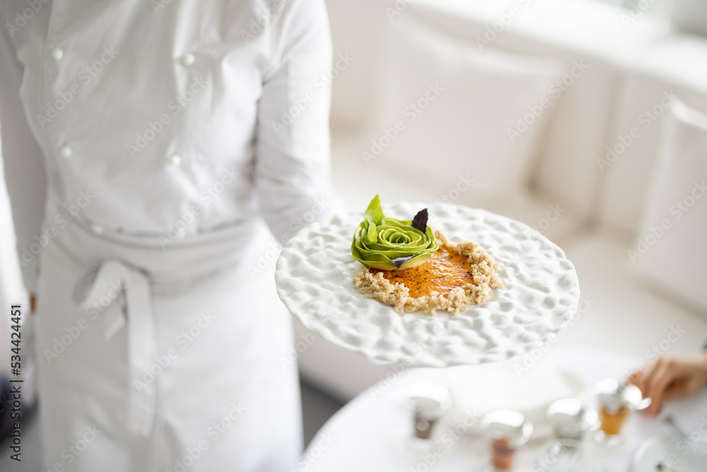 Chef holds a plate with delicious vegetarian meal decorated with flower made of avocado at restaurant of haught cuisine, close-up on dish