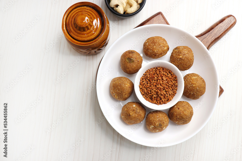 Gond and Methi Ke Laddu or Pinni. Fenugreek Laddu Made From Fenugreek Seeds, Saunf, Jaggery, and nuts. Immunity booster food for winters. Copy space