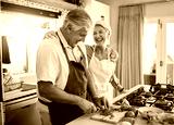 Senior couple, cooking and having fun while preparing a healthy food with vegetables for a vegan meal in the kitchen at home while laughing and having fun. Funny old man and woman helping with dinner