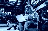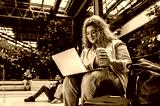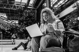 Portrait of female student siting in campus using laptop.