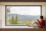 Woman sits with phone on window sill and enjoys scenic view on mountains while resting in wooden house on nature. Recreation and escaping to nature