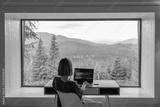 Woman works on laptop while sitting by the table in front of panoramic window with great view on mountains. Remote work and escaping to nature concept