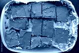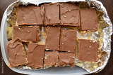 Millionaire's shortbread or chocolate slices or chocolate caramel in a plastic box. Flat lay top view photo.