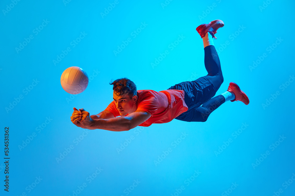 One male volleyball player in orange-black uniform training with ball isolated on blue studio background in neon light. Sport, gym, team sport, challenges