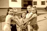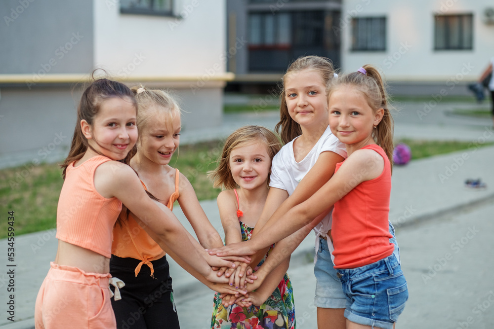 Group of girls children are playing in yard. Childhood, leisure and friendship concept