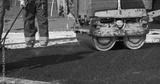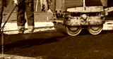 Working with asphalt roller for compacting and smoothing surface at driveway