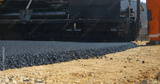 CLOSE UP: View from back of paver machinery leaving behind freshly laid asphalt