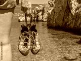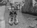 CLOSE UP: Held climbing shoes with climbing boulder above seawater in background