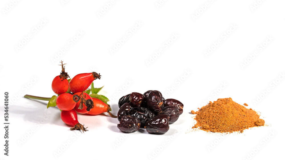 Hagebutten, getrocknet und pulverisiert vor weißem Hintergrund