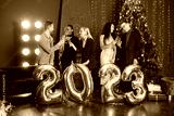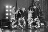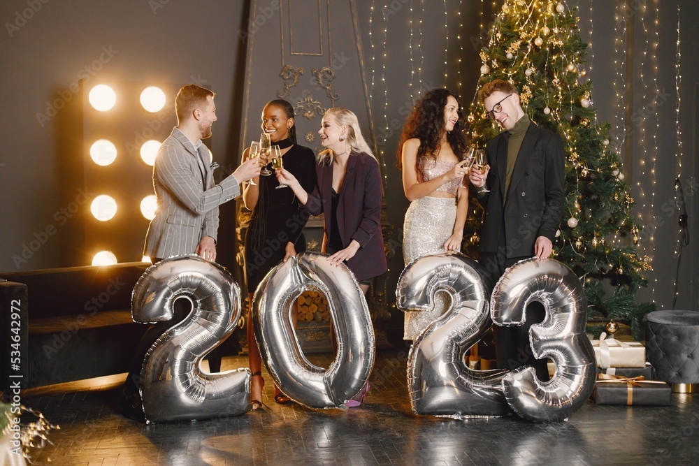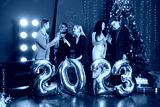 Male and female friends in standing with balloons 2023 for New Year's celebration