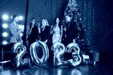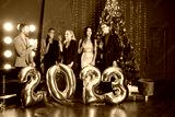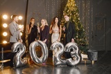 Male and female friends in standing with balloons 2023 for New Year's celebration