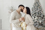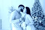 Romantic couple standing near Christmas tree with glasses of champagne