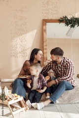 Young family in plaid shirts eating a cookies and hugging