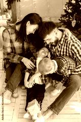 Young family in plaid shirts sitting near Christmas tree