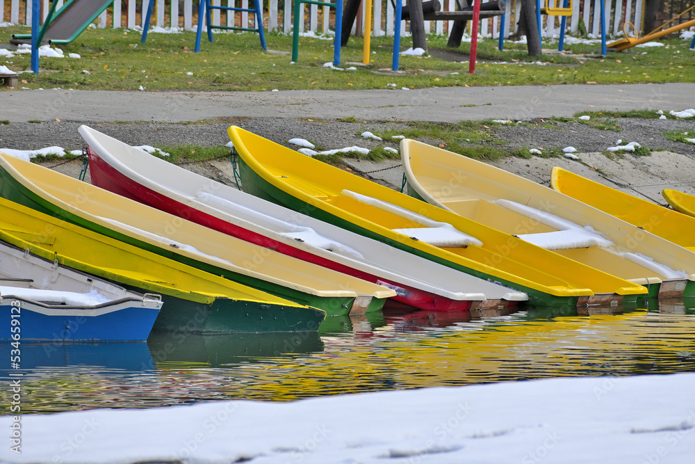 Pleasure boats are parked for the winter and the river pier on an autumn day