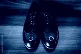 Two gold wedding rings on men's shoes on a wooden brown background. Wedding rings of the bride and groom. Engagement.