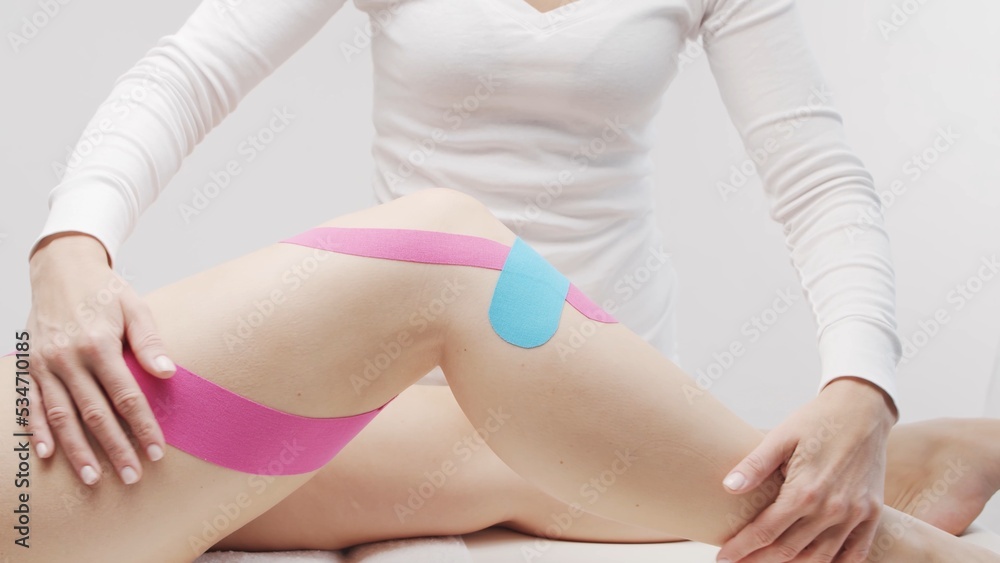 Therapist is applying tape to female body. Physiotherapy, kinesiology and recovery treatment.