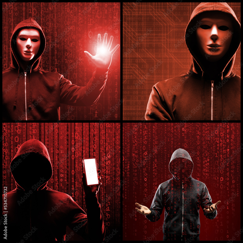 Portrait of computer hacker in hoodie. Obscured dark face. Data thief, internet fraud, darknet and cyber security concept.