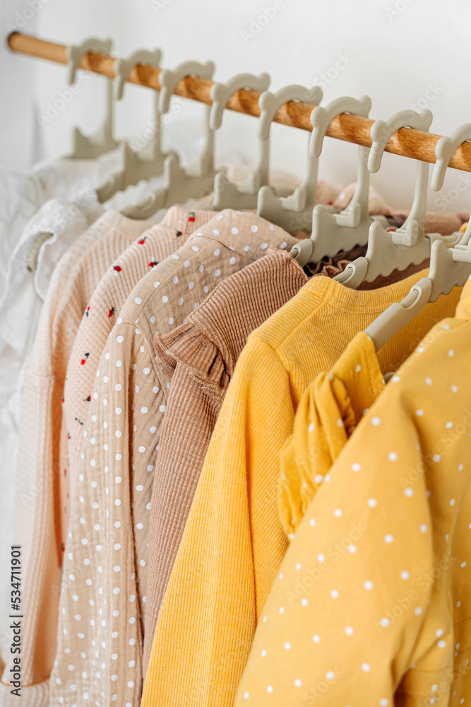 Clothing Rack with children's autumn outfit. Yellow, beige, white jacket, dress and sweaters on hangers in wardrobe. Nursery Storage Ideas. Home kids wardrobe.