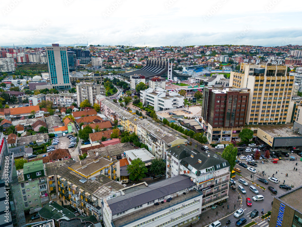 Pristina Modern City Center and Residential Buildings. Aerial View over Capital of Kosovo. Balkans. Europe.