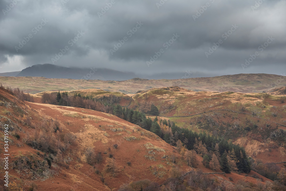Beautiful vibrant Autumn landscape image towards Borrowdale Valley from Castle Crag in Lake Disrtrict