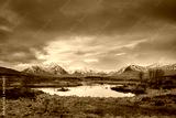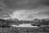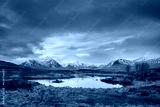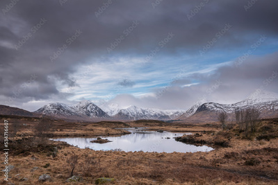 Majestic Winter panorama landscape image of mountain range and peaks viewed from Loch Ba in Scottish Highlands with dramatic clouds overhead