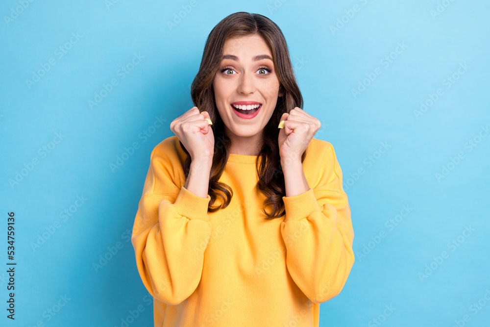 Photo portrait of gorgeous young lady raise fists win lottery cute reaction dressed stylish yellow look isolated on blue color background