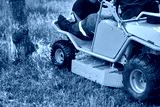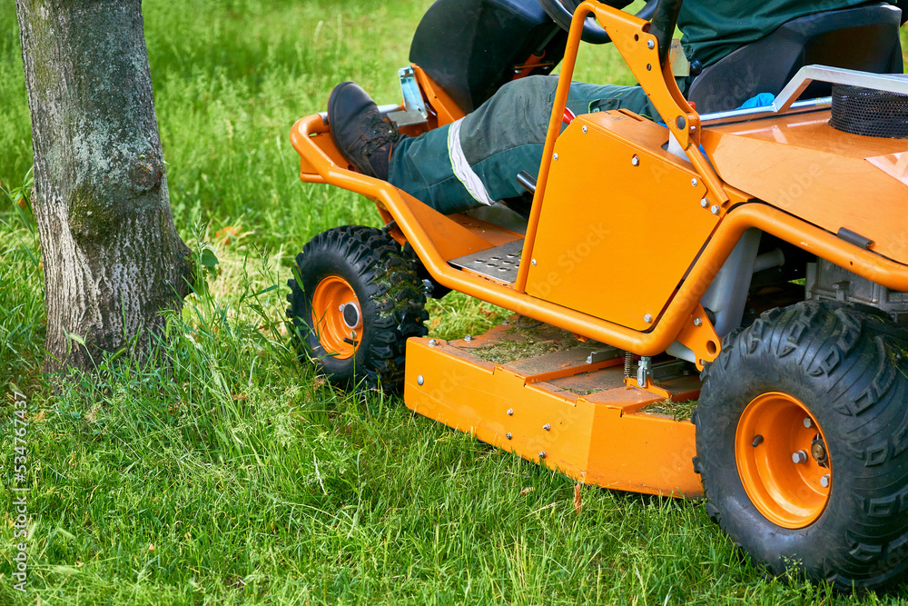 Professional grass cutting on lawns with a mini tractor lawn mower.