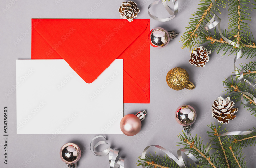 Christmas background, green fir branches, cones and Christmas toys, red envelope and greeting card on a gray background. New year, christmas, holiday, decoration.