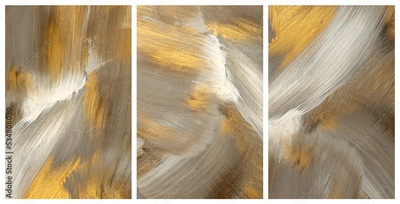 Art acrylic and oil smear blot painting. Interior abstract triptych wall. Beige, brown and gold color canvas texture stain brushstroke background.