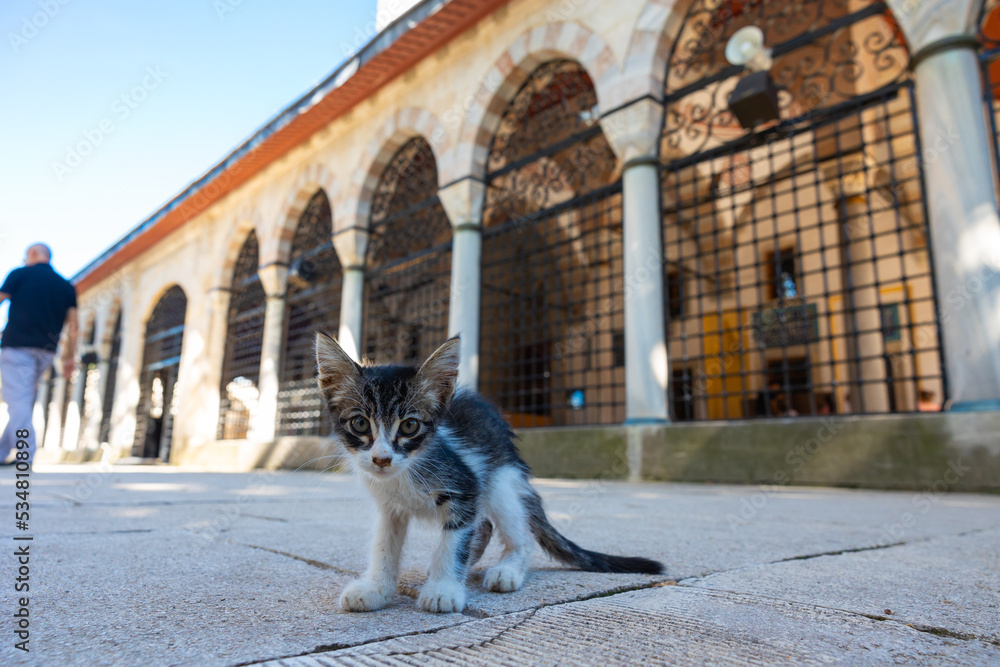 A stray kitten in the mosque's garden in Istanbul. Turkish culture