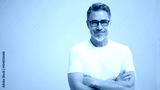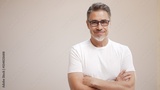 Portrait of happy casual older man smiling, Mid adult, mature age guy with gray hair in glasses, Isolated on white background, copy space.