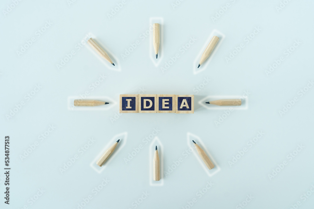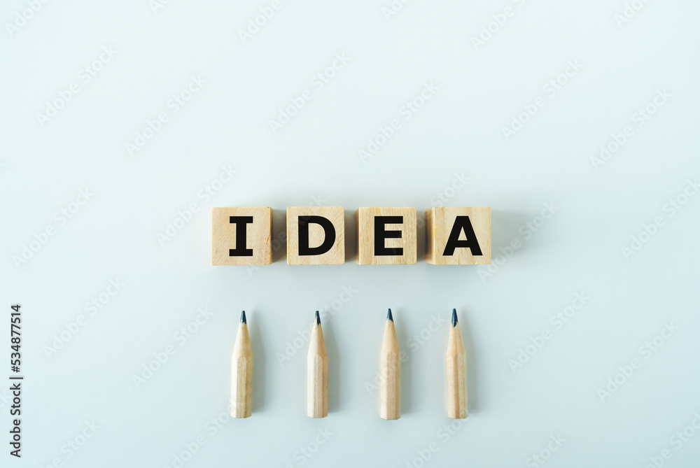 Wooden cube with IDEA wording and pencil. Success idea of business working knowledge, education learning and creativity thinking and training. Skill development and improvement