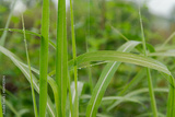 Ogród po przejściu deszczu. Miskant wysoka trawa ozdobna o grubych dużych źdźbłach pokrytych dużymi kroplami wody.