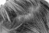 Psoriasis of the scalp , psoriatic redness, peeling and crusts on the scalp of an unrecognizable woman. An autoimmune, incurable dermatological skin disease.