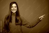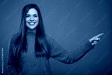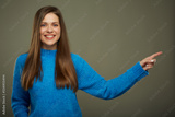 Smiling woman in casual blue warm sweater pointing finger at copy space. Isolated female portrait.