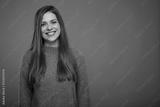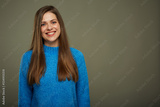 Smiling woman in casual blue warm sweater. Isolated female portrait.