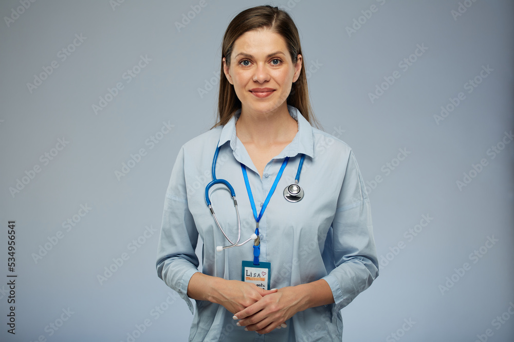 Smiling doctor woman in blue shirt with stethoscope isolated portrait of female medical worker.