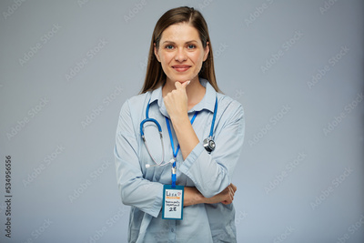 Thinking smiling doctor woman Isolated portrait on blue background.