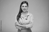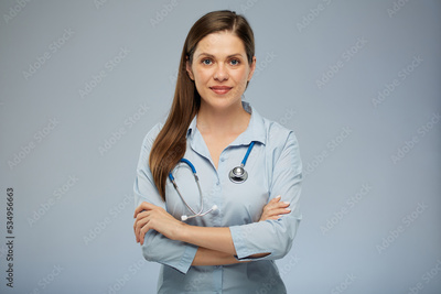 Smiling doctor woman holding stethoscope standing with arms crossed. Isolated portrait of female medical worker on blue background.