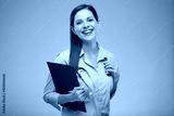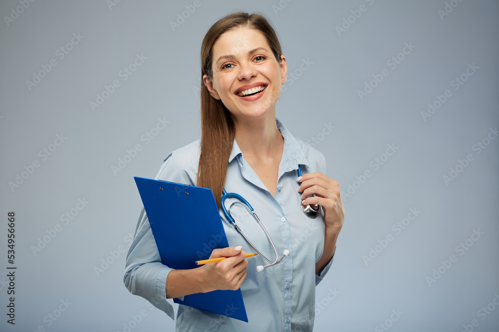 Doctor woman in medical uniform holding clipboard with health insurance. Isolated portrait of female medical worker