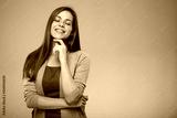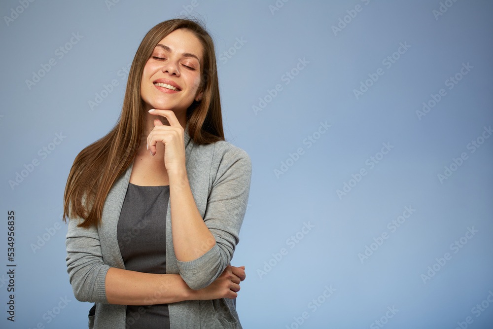 Thinking smiling business woman with eyes closed touching her face. isolated portrait.