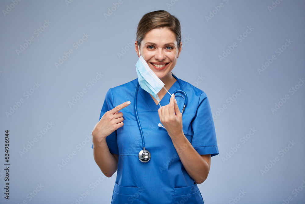 Nurse woman or doctor in blue medical mask points finger. Isolated female portrait.