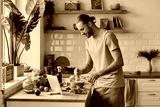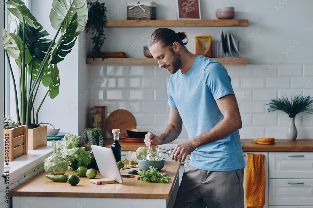 Handsome young man pouring some olive oil on salad while preparing food at the kitchen