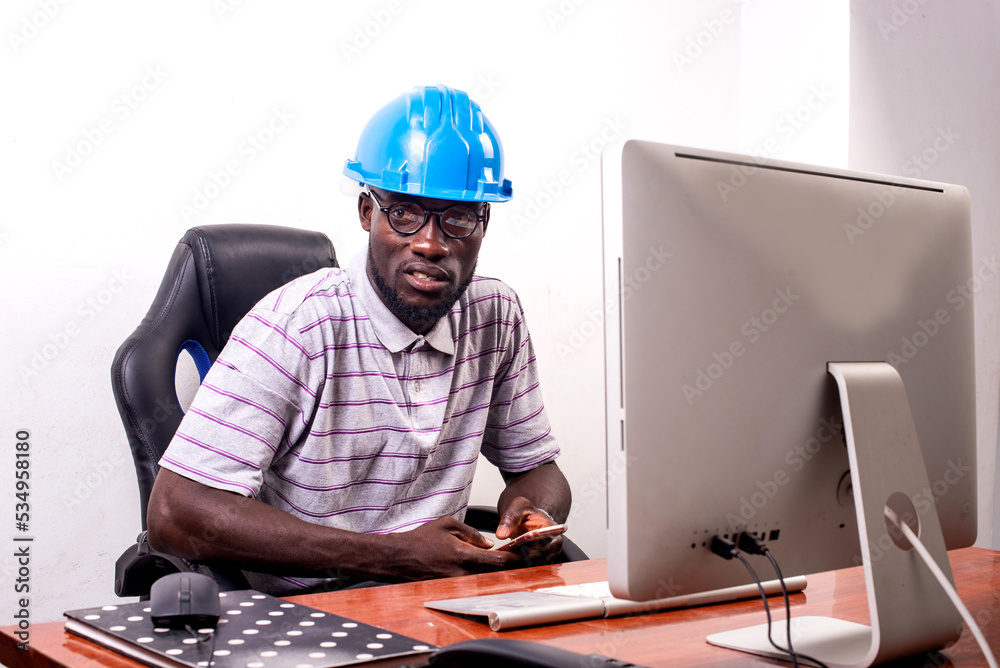 young man engineer sitting at the desk using a mobile phone.