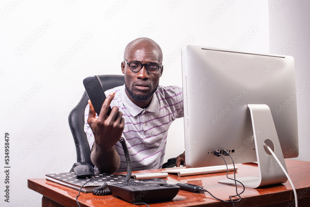 young businessman sitting at desk facing laptop and holding telephone handset.