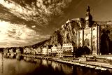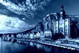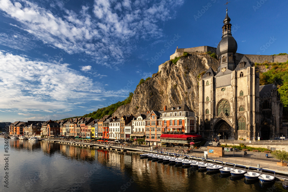 Classic view of the historic town of Dinant with scenic River Meuse in beautiful golden evening light at sunset, province of Namur, Wallonia, Belgium