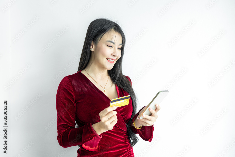 Beautiful Asian woman in red dress holding credit card and smartphone on white background, Asian woman smiling showing presenting credit card, Woman holding bank business credit card shopping online.